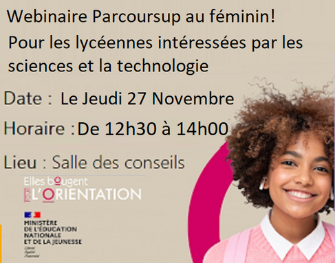 Dans le cadre de nos actions pour la promotion des filles en sciences et en collaboration avec l'association Elles bougent!, nous invitons les lycéeennes intéressées par des cursus scientifiques et techniques à suivre un webinaire dédié à Parcoursup au féminin! pour le cursus scientifiques et techniques.